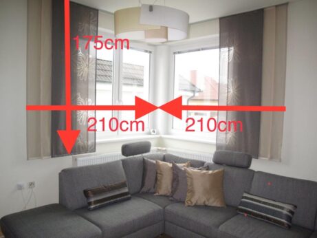 - textilní materiálVybraný materiál béžový bez vzoru Kanton col. 16 v šíři 320cm s cenou 625,- Kč/bm v kombinaci s efektním vzorovaným materiálem Juliana col. 9 v šíři 280cm za cenu 940,- Kč/bm. Celkem tedy potřebujeme materiálu Kanton col. 16 4ks o šíři 80+12cm záložky - celkem 3,68m a materiálu Juliana col. 9 2ks 80+12cm - celkem 1,84m.