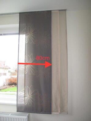 - závěsný systémZávěsný systém japonské stěny je jednoduchá pojezdová lišta s potřebným počtem zalisovaných suchých zipů uchycených do systému pojezdovými kluzáky. V tomto případě tedy potřebujeme 2,1m + 2,1m tříkolejového systému, kde v každé kolejnice budeme mít pojezd se zalisovanými zoubky suchého zipu o šíři 80cm, aby se jednotlivé panely překrývaly a netvořily se průhledy.