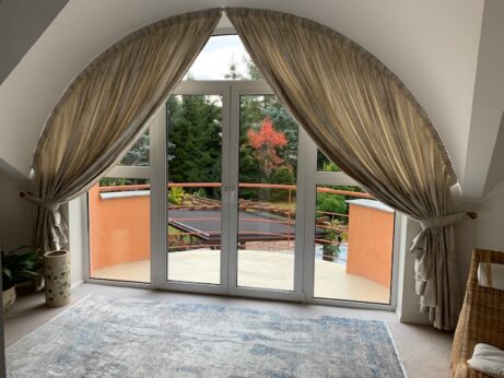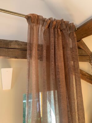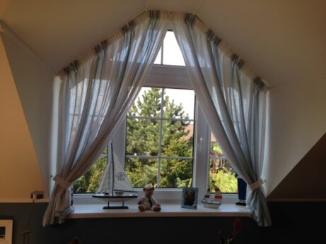- U šikmých stropů ve štítech je třeba si uvědomit, že závěs/záclona musím být uprostřed zastopován, aby nám neujel. Tato alternativa je spíše pro záclonovou dekoraci. Závěs by nám omezoval průchod světla. Pokud je ale více oken v místnosti nebo okno je dost široké, můžeme tento způsob uchycení použít samozřejmě i pro méně světlo propustné materiály.