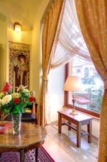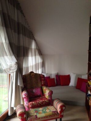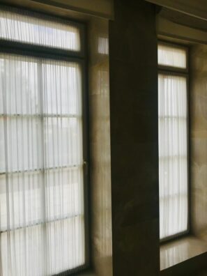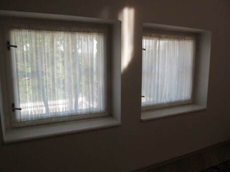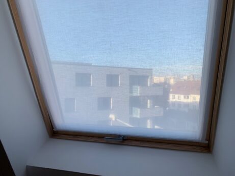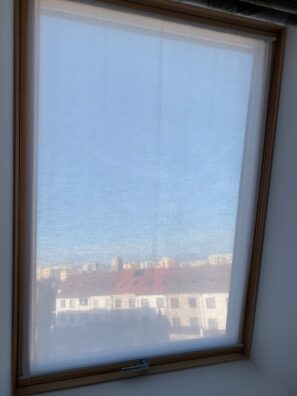 - Moderní alternativou vitrážky je natažená rovná dekorace vypnutá na tyčce, která tvoří jen drobnou pomyslnou clonu zabezpečující soukromí.