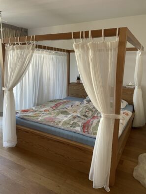 - V případě celoplošného přehozu je třeba zaměřit rozměr celého lůžka + bočních přesahů pod matraci či celý rám postele. Zamezí se tím tvoření zbytečných rušivých linií a přehoz tak krásně splyne s liniemi lůžka.